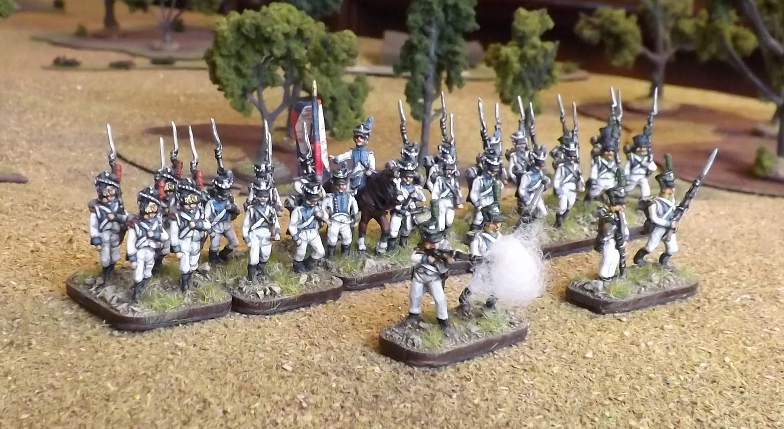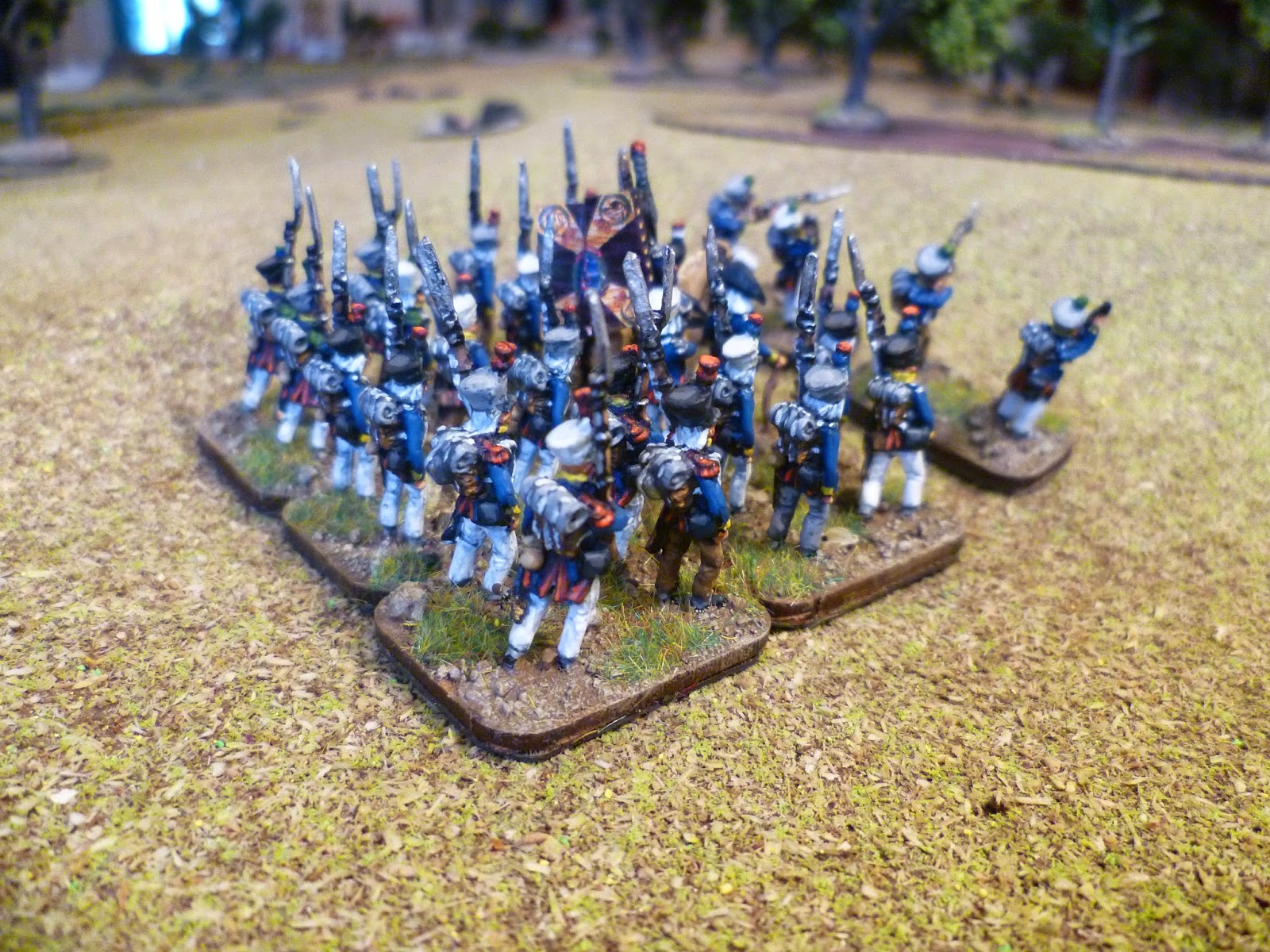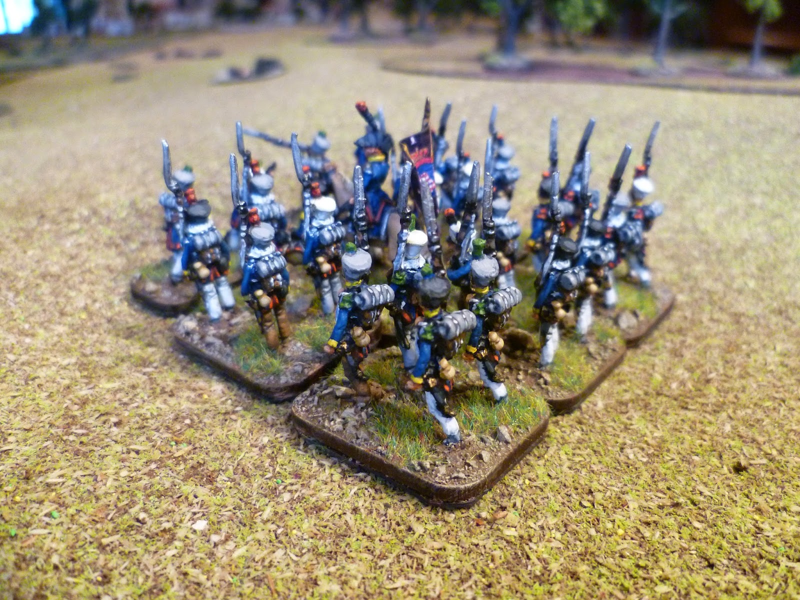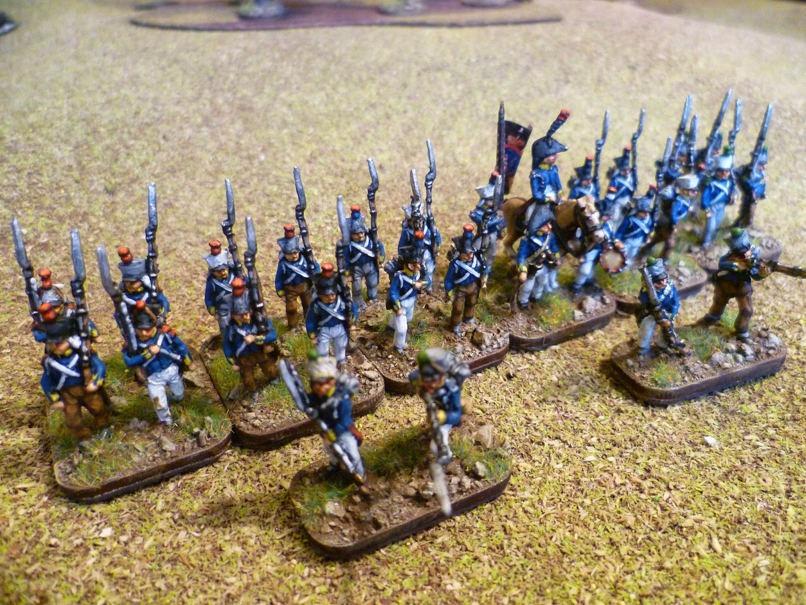 Next up were the voltiguers, both skirmishing and in the unit. As all the other figures were in march pose with sloped arms I decided to remodel some French voltigeurs with side plumes. With the skirmish elements I kept two of the advancing poses and put head transplants on two skrmishing French voltigeurs.
