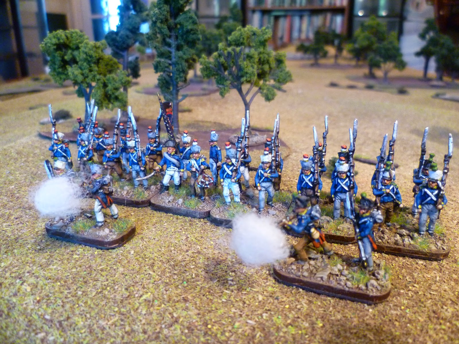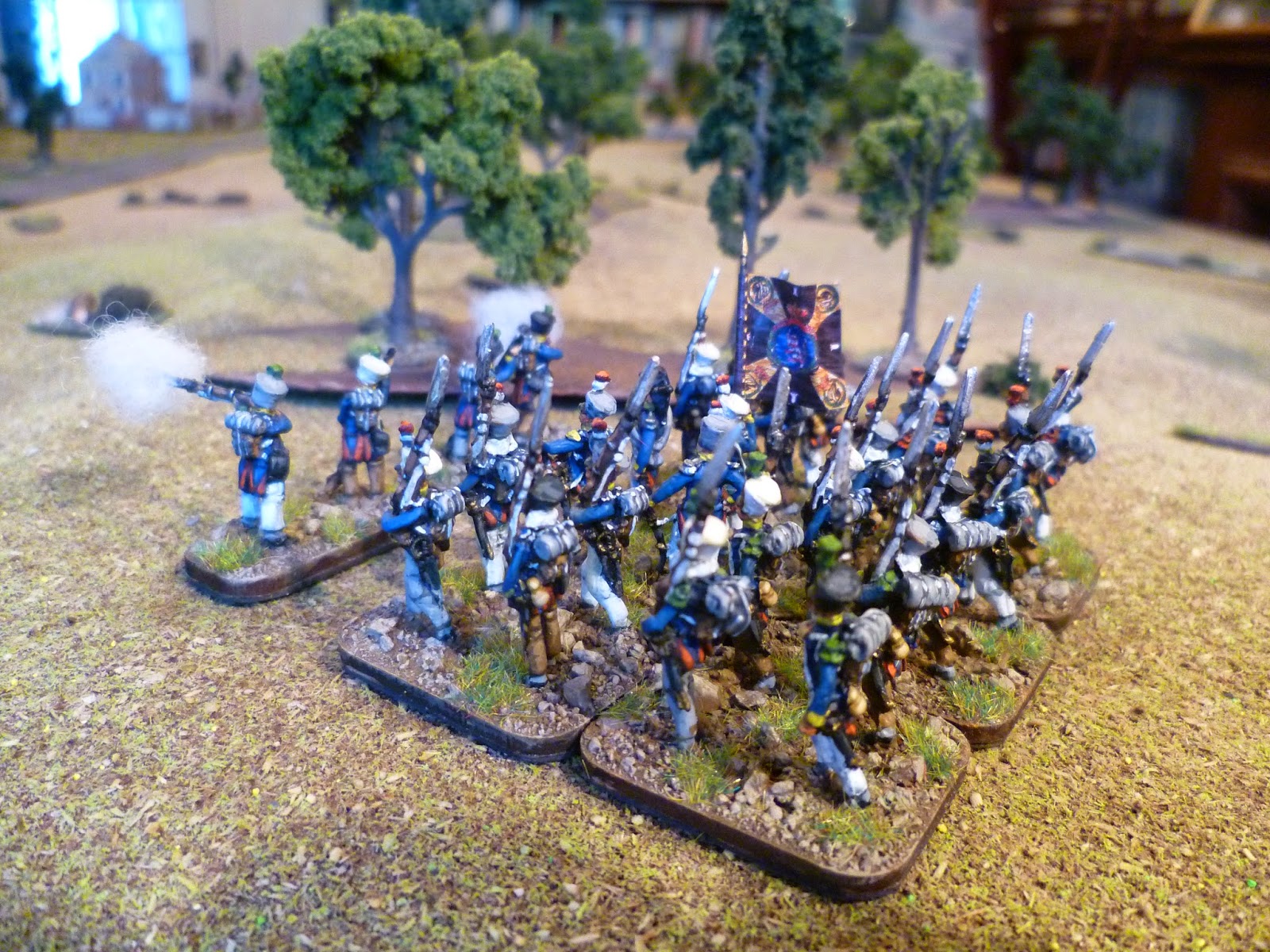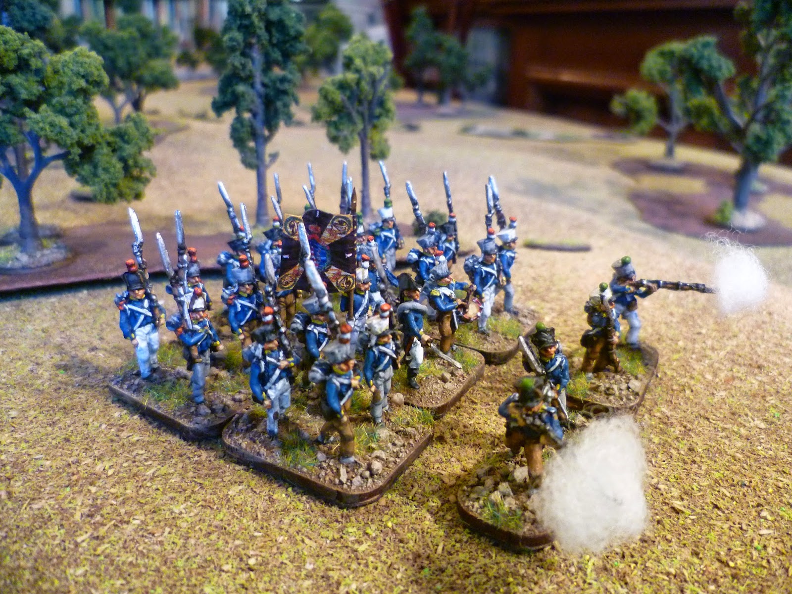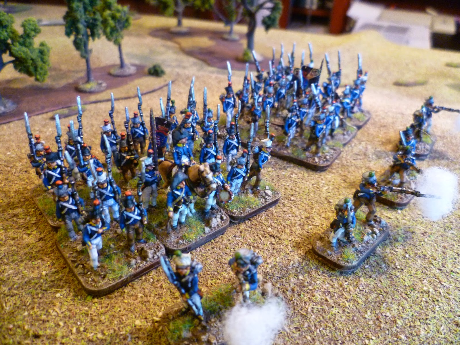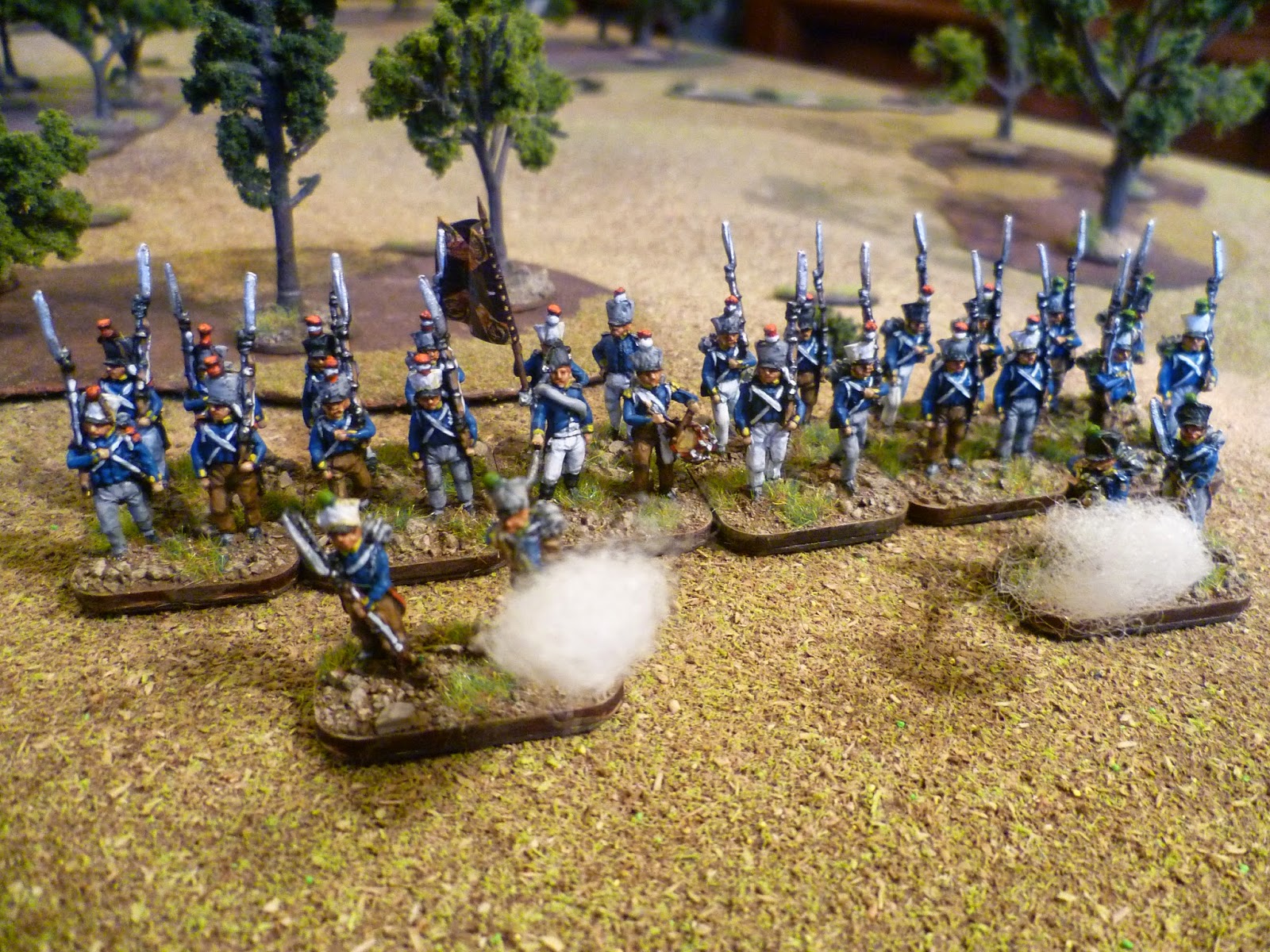 Next up were the voltiguers, both skirmishing and in the unit. As all the other figures were in march pose with sloped arms I decided to remodel some French voltigeurs with side plumes. With the skirmish elements I kept two of the advancing poses and put head transplants on two skrmishing French voltigeurs.