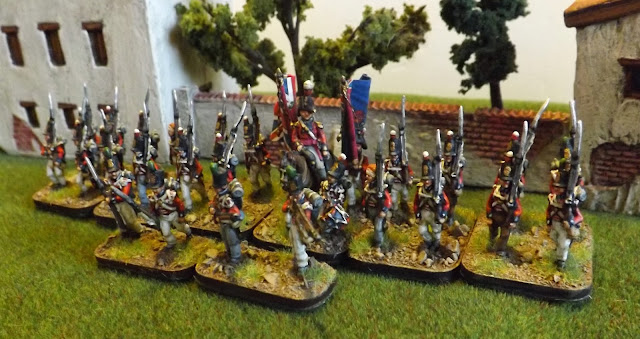 The first battalion of the 17th Legere sees the completion of my penultimate Legere battalion for Oporto and provides a chance to illustrate a variation in the look of these units in the Peninsula. I have taken the Bucquoy plates as the inspiration for the look of this unit which suggests the wearing of white waistcoats under the habite.
