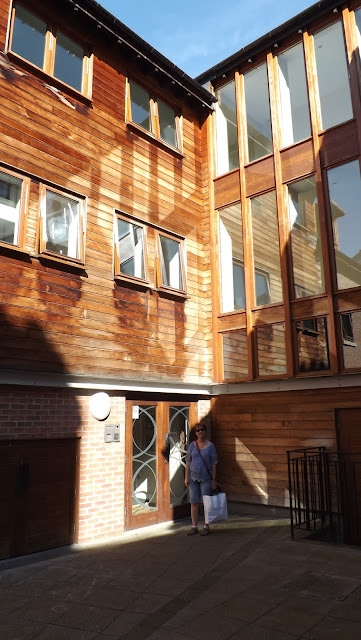 The wood and plaster building on the inner side dates from Elizabeth I and is now a snug coffee shop frequented by students working on essays on laptops and swapping gossip, and has a great roof top terrace with the wooden balustrade seen above, where Carolyn and I enjoyed a much needed sit down and drink on what was a very hot day.