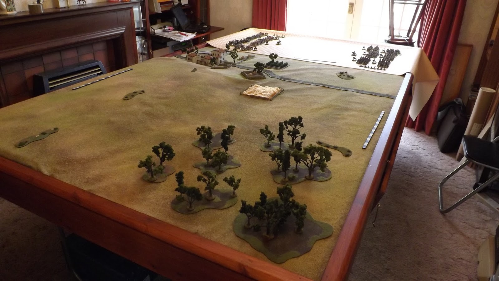 The picture above shows the layout for the scenario, with Vimiero Hill to the left and the cork woods nearest to camera. Top left is Vimiero itself with fields and vineyards along the road into town. The little scrub markers on Vimiero Hill show where the military crest is to allow the British to judge when their units are out of sight to French units on the low ground