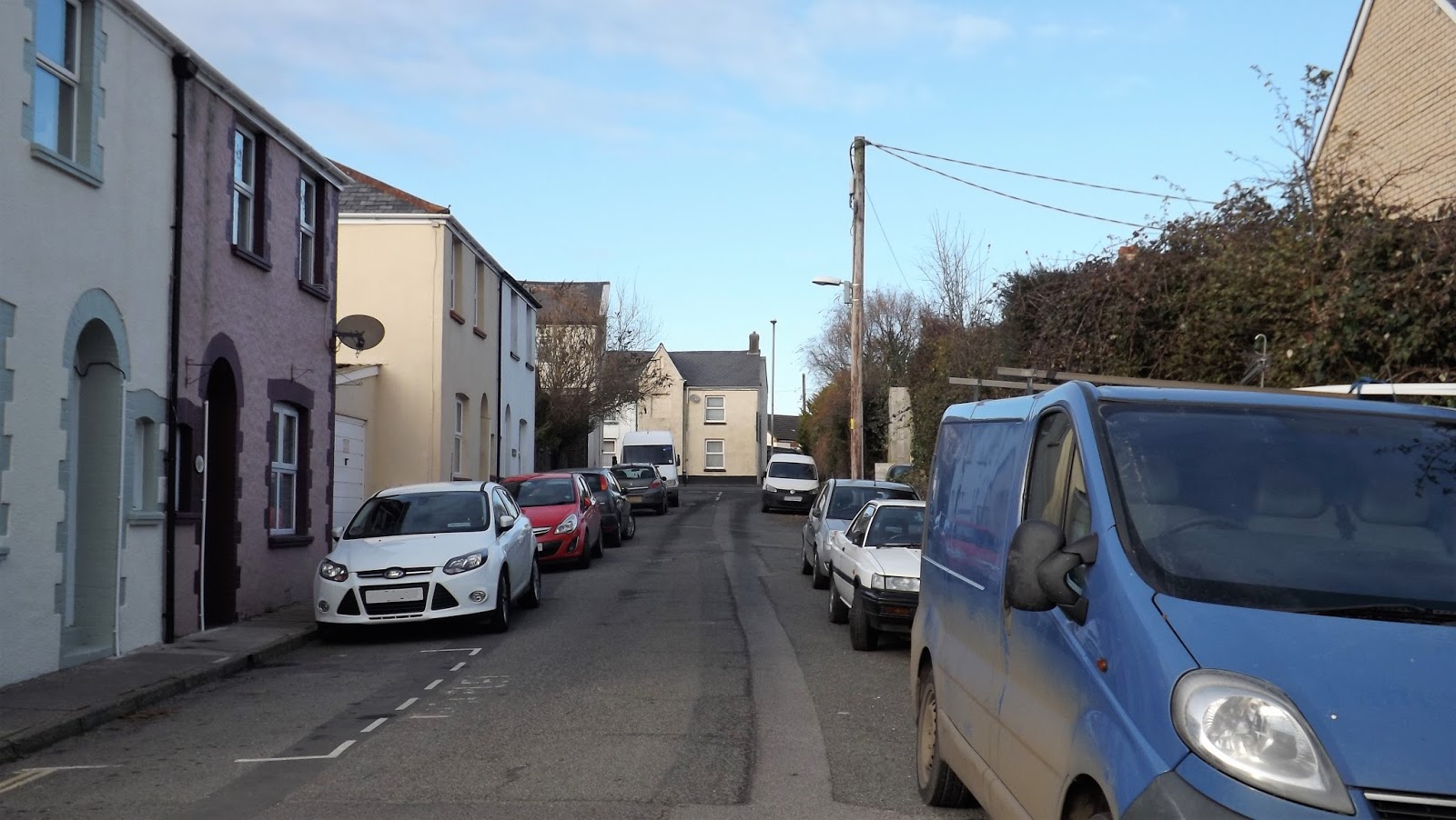 | Looking east along Well Street towards the town centre. The second barricade blocked the street about in between the light blue care (left) and the white care on road (right) |