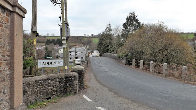 | The bridge at Taddiport and the road leading away to Royalist Cornwall and away from the New Model Army now in possession of Torrington |